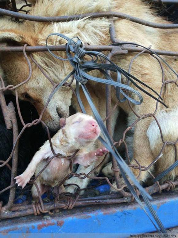 Hình ảnh chú chó con ra đời khi chó mẹ đang bị nhốt và đưa đến nơi giết thịt được chia sẻ và tranh luận rộng rãi trên khắp các mạng xã hội.